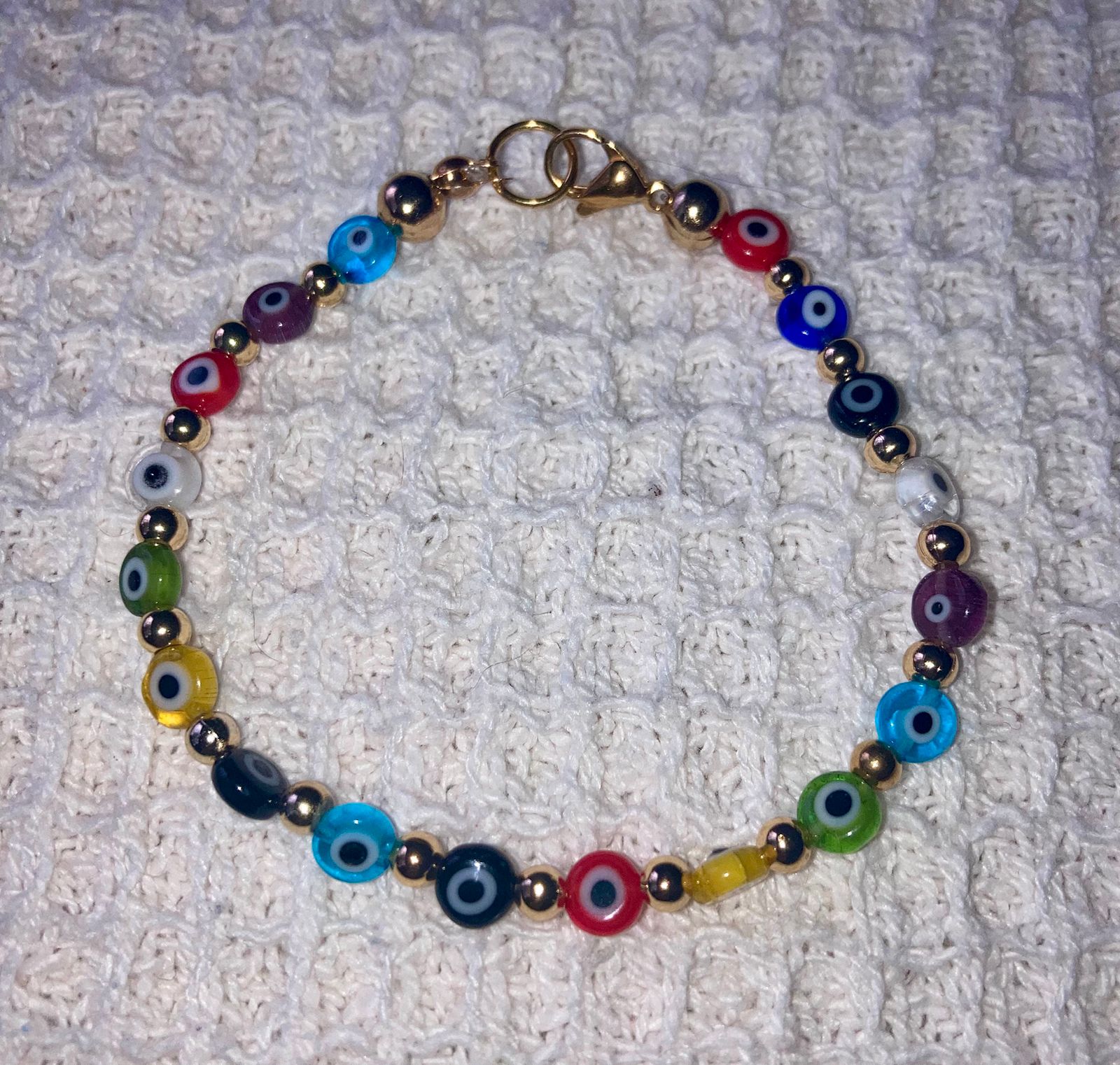 Descripción: Colorida y llamativa, esta pulsera de talla única está compuesta por cuentas de vidrio multicolor con diseños de ojo turco, alternadas con pequeñas esferas doradas. Se cree que estas cuentas protegen contra las malas energías, convirtiéndola en un accesorio tanto estético como simbólico.